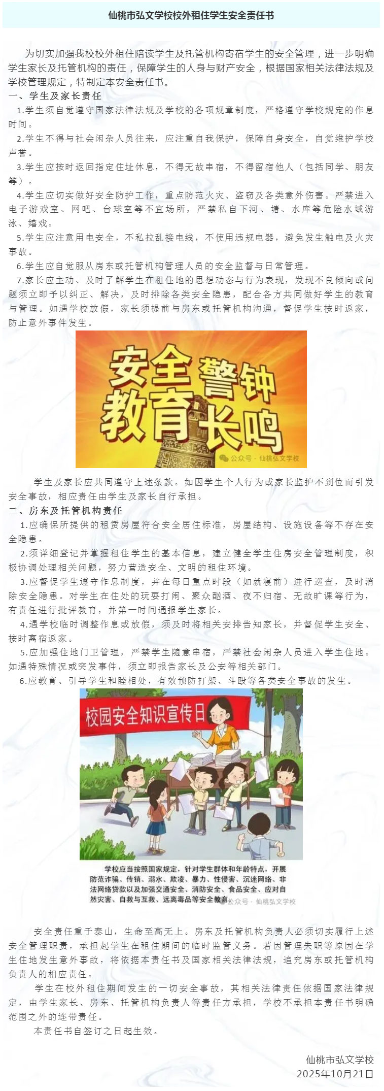仙桃市弘文学校校外租住学生安全责任书