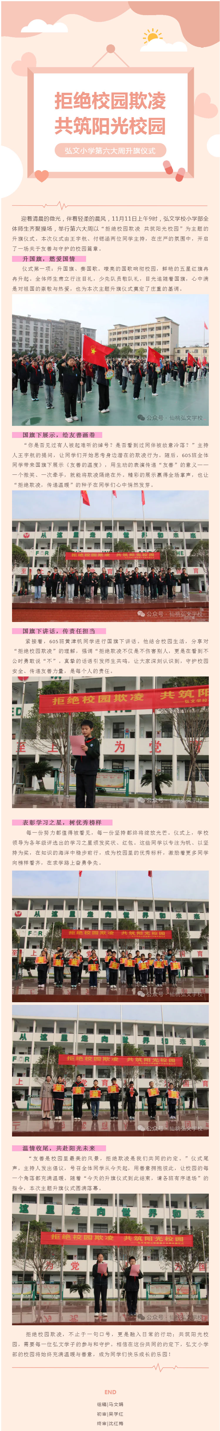 拒绝校园欺凌,共筑阳光校园——弘文小学部第六大周升旗仪式