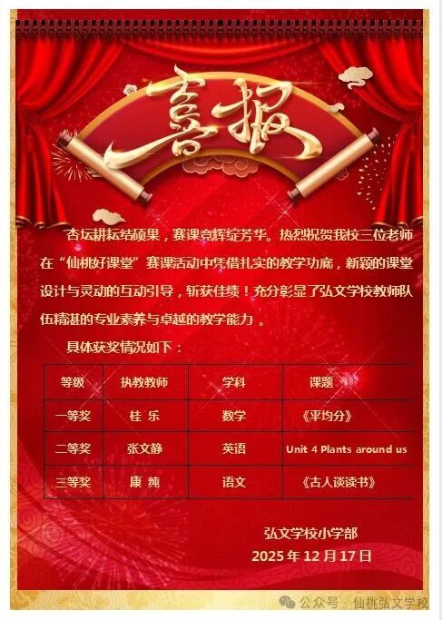 杏坛耕耘结硕果,赛课竞辉绽芳华。热烈祝贺我校三位老师在"仙桃好课堂"赛课活动中凭借扎实的教学功底,新颖的课堂设计与灵动的互动引导,斩获佳绩!充分彰显了弘文学校教师队伍精湛的专业素养与卓越的教学能力。